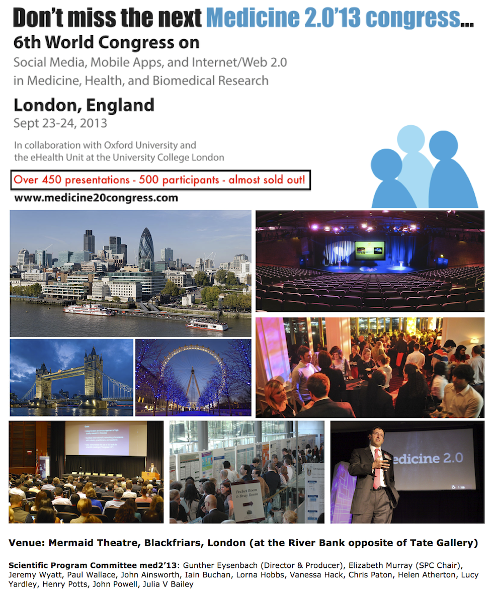 If you missed this years' astonishing Medicine 2.0'12 program, make sure you don't miss next years' Medicine 2.0'13 conference in London. Mark your calendar! Sep 23-24, 2013 (Abstract Submission Deadline: March 7th).