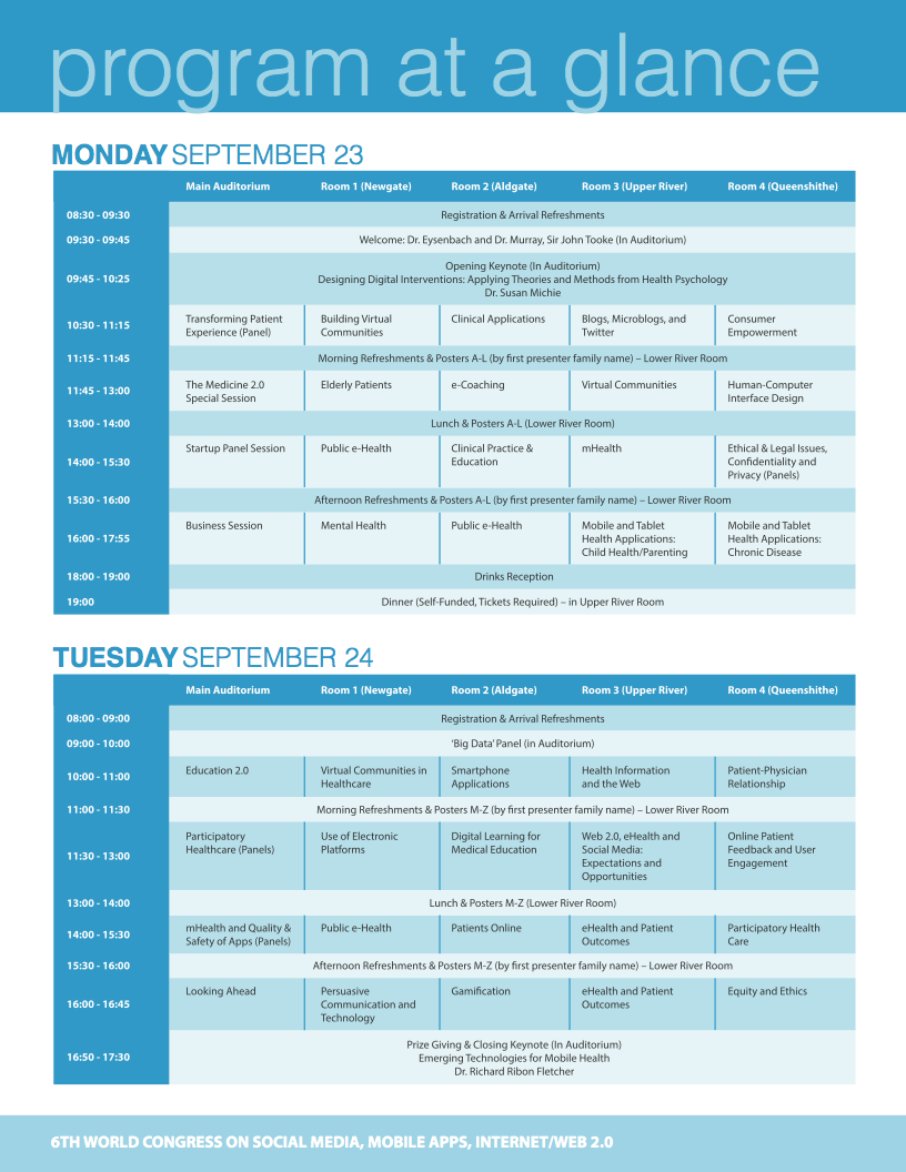 Medicine 2.0® is happy to support and promote other conferences and workshops in this area. Contact us to produce, disseminate and promote your conference or workshop under this label and in this event series. In addition, we are always looking for hosts of future World Congresses. Medicine 2.0® is a registered trademark of JMIR Publications Inc., the leading academic ehealth publisher.