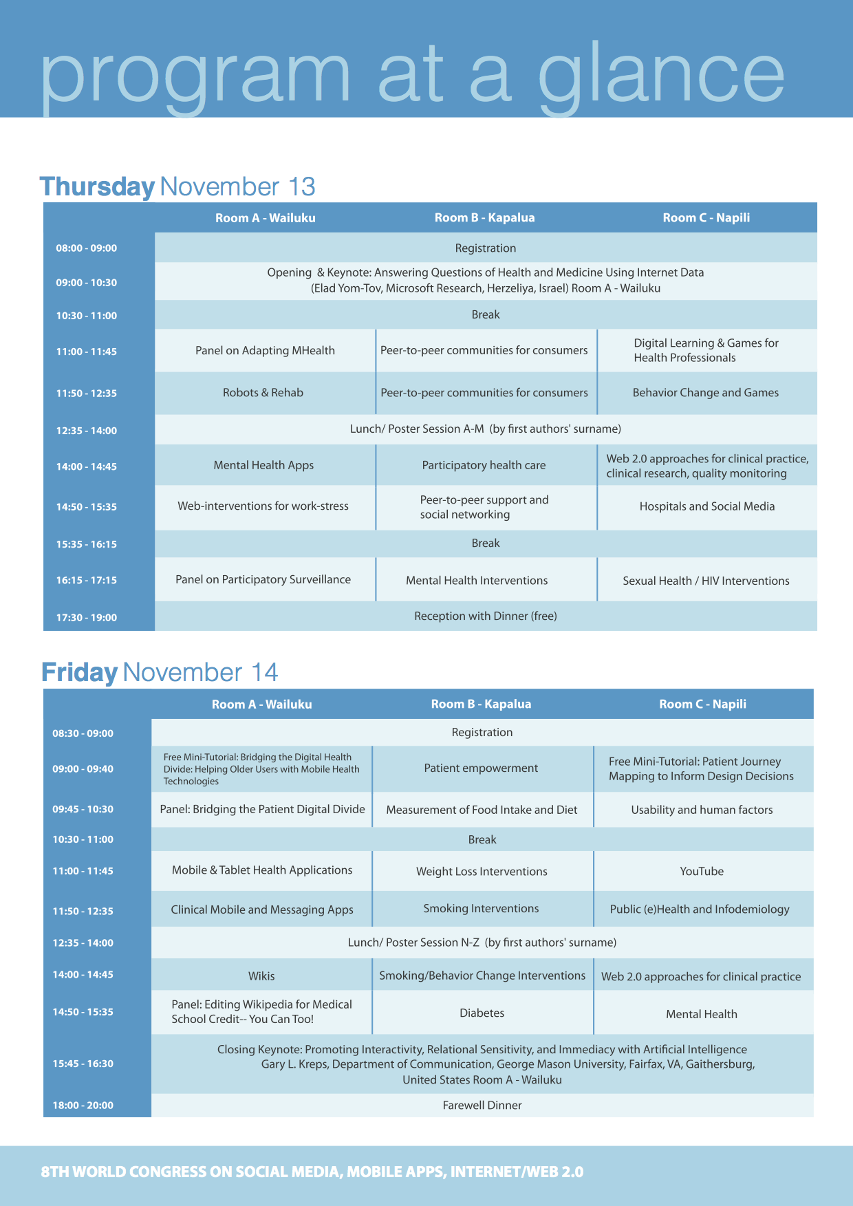 Medicine 2.0® is happy to support and promote other conferences and workshops in this area. Contact us to produce, disseminate and promote your conference or workshop under this label and in this event series. In addition, we are always looking for hosts of future World Congresses. Medicine 2.0® is a registered trademark of JMIR Publications Inc., the leading academic ehealth publisher.